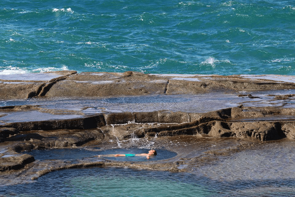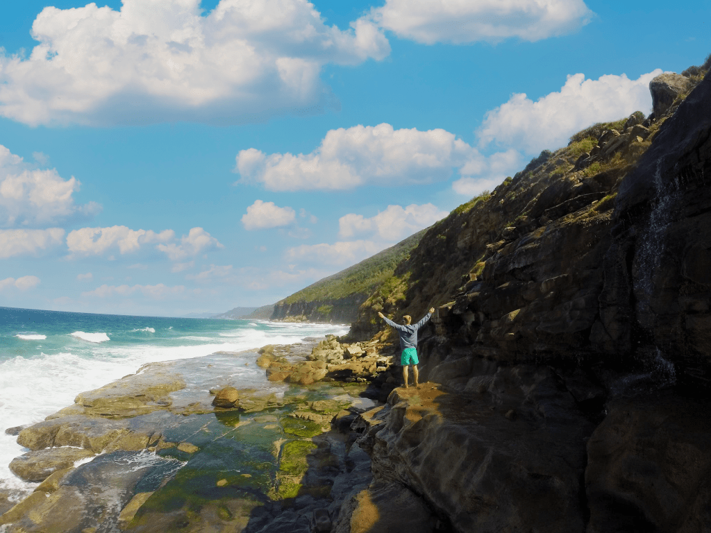 There should be a connecting trail that drops straight down the headland cliffs, from the metal walkway, to the rocky shelf on the right of the pools. We traversed this fairly easily but it may be difficult or slippery, especially after bad weather. The other option is following the intersection toward the Burning Palms track which is another 900 m and will take you down to Burning Palms Beach. From here turn right and traverse onto the rocky shelf with the headlands on the right of you.