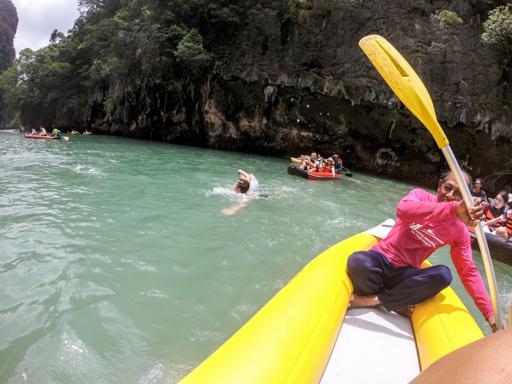 The tour picked us up from our hostel included in the price, and making it a stress-free day. We boarded a double-decker boat with at least 20 other people and headed off. I wore a swimsuit and brought a backpack with water, sunscreen, snacks, and my Gopro. The boat ride was relaxing and there were hardly any waves, so if you get seasick I wouldn’t be too worried unless weather conditions are unstable. The boat took us out to the Hong islands first where we dawned life jackets, got into kayaks, and explored the rocky cliffs and sea caves. Each kayak has a guide that paddles for you so you just get to enjoy the sightseeing.