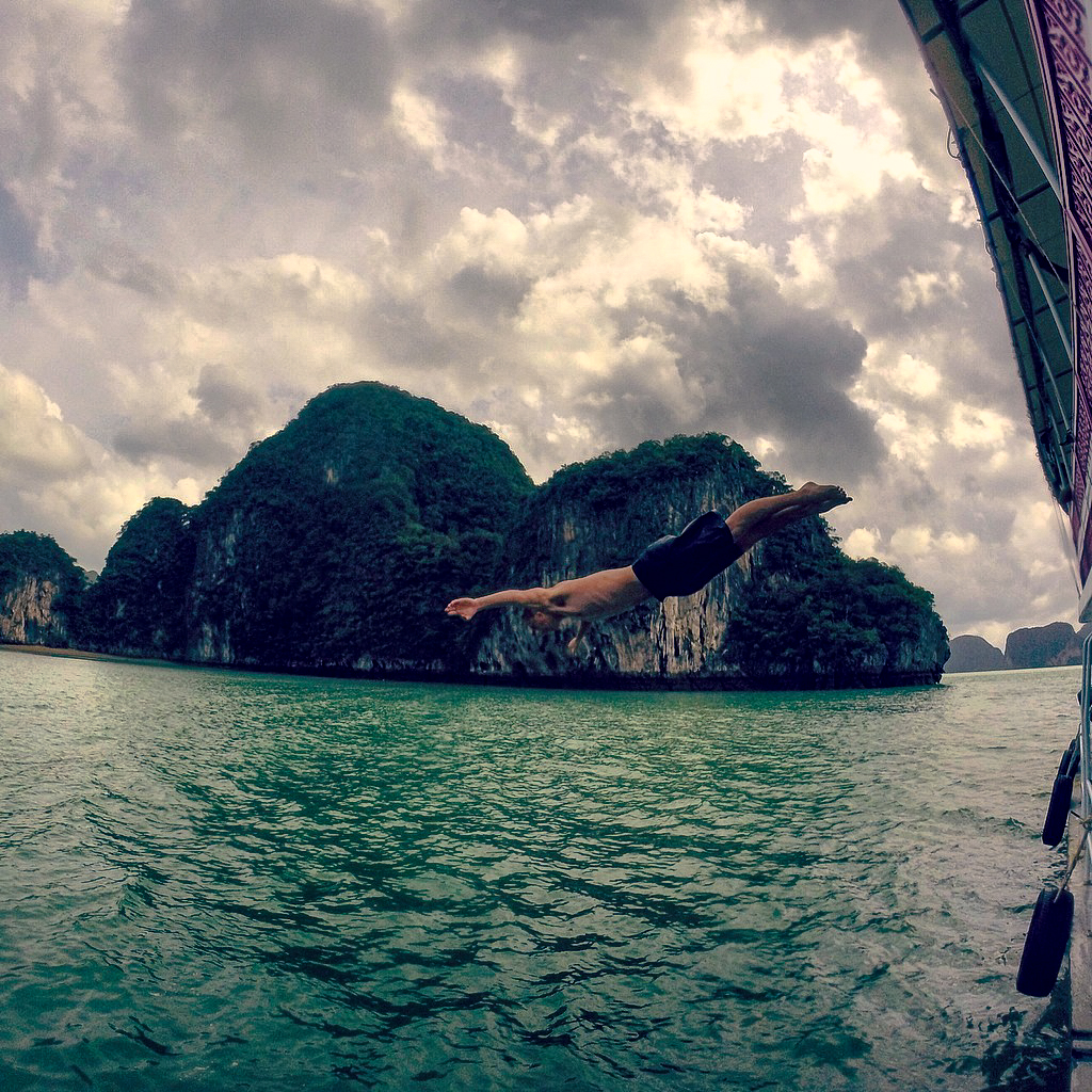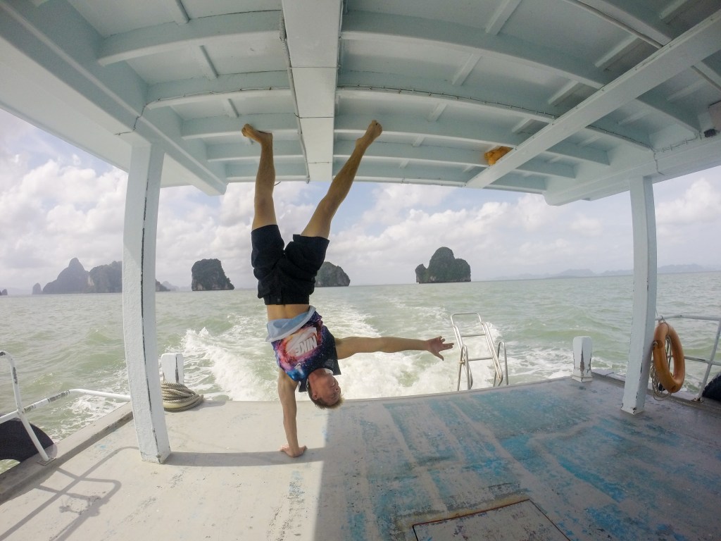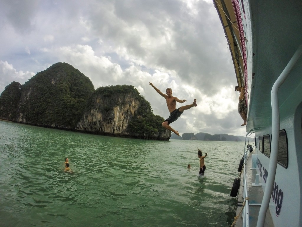 After leaving James Bond Island our tour anchored our boat next to a small island with a beach and told us we could jump in. I was all for it and flung myself off the top of the boat, much to the spectacle of the other tourists and boat guides. I was doing backflips and crazy stuff, and soon other people joined me in the water. This is definitely not the crystal clear water you would find on Ko Phi Phi or other beaches in Phuket, but I was living my best life! After swimming and jumping around for a while we began to drive again and that’s when I remembered there was a show included on this tour, and I could never have been prepared for it.