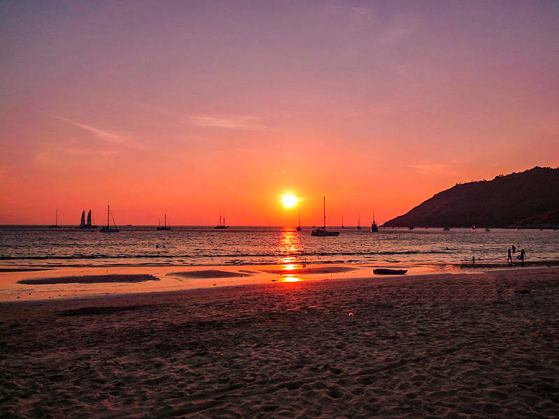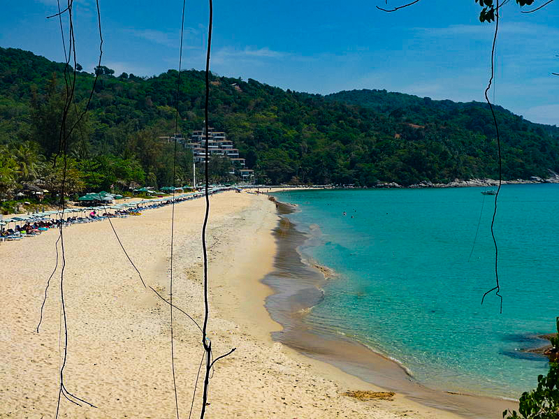 Another one of my top three Phuket beaches is Nai Hard, which is isolated in south Phuket and less crowded. The beach has perfect sandy conditions with calm, crystal clear water. There are lots of places to eat and drink lining the beach. This is a great beach to watch the sunset, and it is right below the windmill viewpoint perfect for a quick hike and lookout.